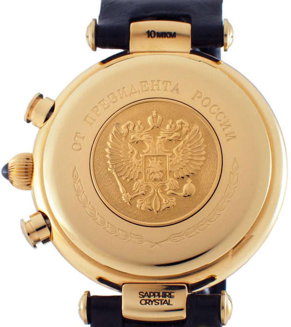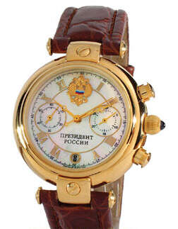 Дизайн часов, выполнен в строгом официальном стиле, удовлетворяющий самым требовательным вкусам: коричневый кожаный браслет прекрасно сочитается с позолоченным корпусом и головкой часового механизма с сапфиром. На вершине циферблата есть позолоченная эмблема российского герба (двуглавый орел) и флаг, внизу позолоченная надпись заглавными буквами "ПРЕЗИДЕНТ РОССИИ".
