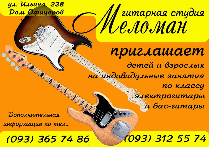 Гитарная студия "Меломан" приглашает всех желающих на занятия по классу электрогитары и бас-гитары. Все занятия индивидуальные! Дополнительная информация по тел.: 093-365-74-86 или 093-312-55-74. Занятия проводятся по адресу г.Черкассы, ул. Ильина 228, Дом Офицеров. |