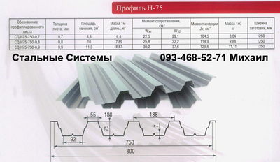 Сайт http://sites.google.com/site/profnastilborispol/ Стальные Системы Профнастил Н-75 производится на заводе в борисполе. Н-75 является несущим профнастилом..может использоваться для перекрытий(заливки бетоном),а так же и накрытия кровли. Параметры: Ширина полная 800мм, полезная 750мм. Консультации по телефону 093-468-52-71 Михаил |
