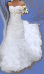 Шикарное свадебное платье с длинным шлейфом,цвет белый, корсет на шнуровке.Под лифом большая брошь с кристаллами Swarovski.Очень эффектно выглядит.Пошито по индивидуальному заказу.Возможен прокат. |