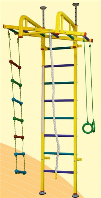 В комплект спортивного уголка с рукоходом входят: шведская стенка, турник, веревочная лестница, канат, кольца, рукоход. Варианты крепления спортивного уголка с рукоходом: пол-потолок, пол-стена, пол-потолок-стена.