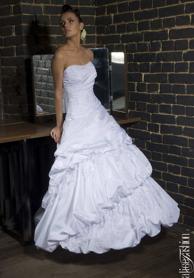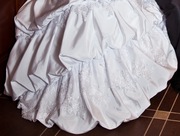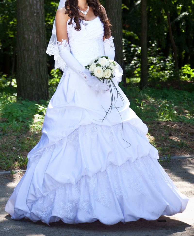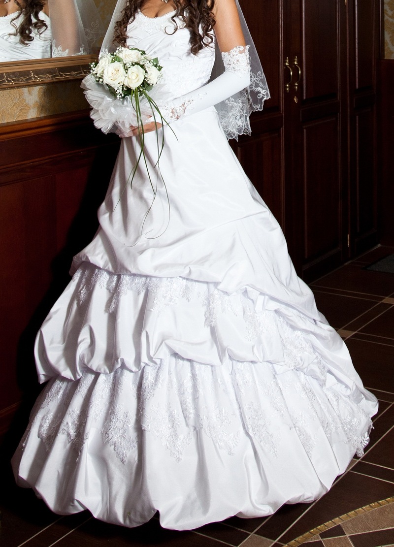 Продам свадебное платье, купленное в салоне Alice Fasion. Наряд в отличном состоянии, после химчистки (до этого одевался один раз), белого цвета, ткань тафта, украшенный кружевами и стразами. Состоит из корсета на шнуровке и юбки, длинна которой регулируется. Юбка переходит в маленький шлейф, который очень удобно подстегивается. Вместе с платьем идет подъюбник тройка с фатином, перчатки и туфли. |