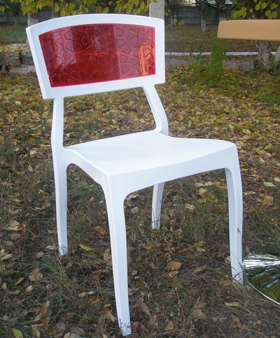 Стул изготовлен из высокопрочного пластика, без подлокотников, на спинке вставка из акрила красного цвета, классический дизайн, возможно применение на улице и внутри помещений, размер 41*56*81 см. |