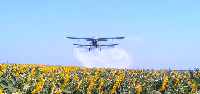 Внесение фунгицидов по подсолнечнику, кукурузе, сое и другим сельскохозяйственным культурам самолетом Ан-2 и вертолетом. Норма вылива рабочего раствора: 25 - 100 литров на один гектар. Стоимость химической обработки посевов самолетом составляет от 55 грн/га без учета стоимости ГСМ (бензин марки А-95), а вертолетом от 85 грн/га с учетом стоимости авиакеросина. Для самолета Ан-2 не требуется постройка специальных взлетно-посадочных полос (ВПП) и аэродромов, кукурузник выполняет полеты с многолетних трав, пастбищ, стерни, паров, грунтовых площадок или участков дорог шириной 6-8 метров. |