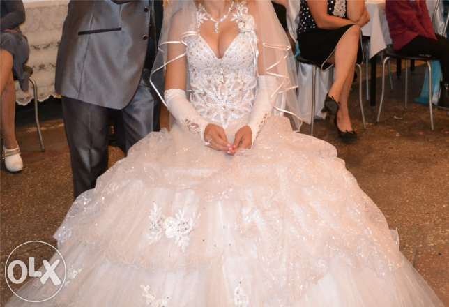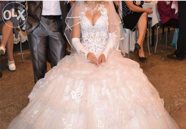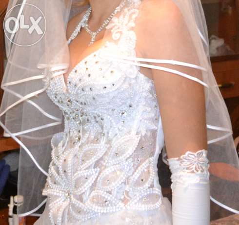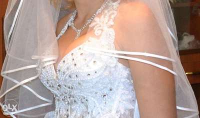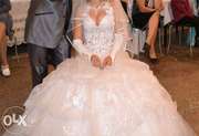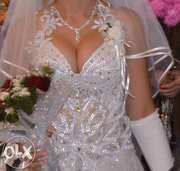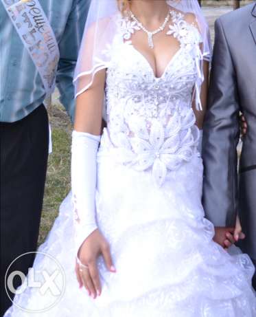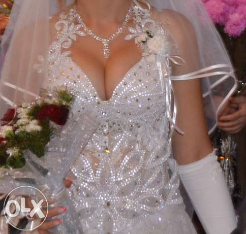 Свадебное платье в отличном состоянии раз одето. Обшитое камнями, хорошо видно на фото. Шикарно смотритса... Платье купила в ноябре 2014 года. круг имееться на 5 колец...Размер 44-46.. |