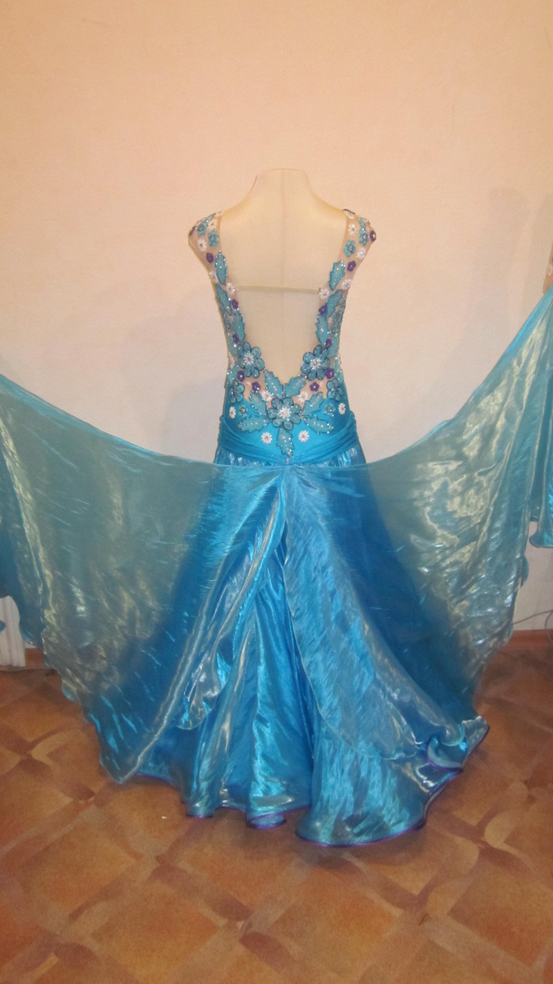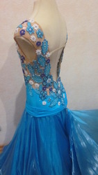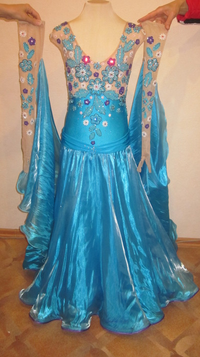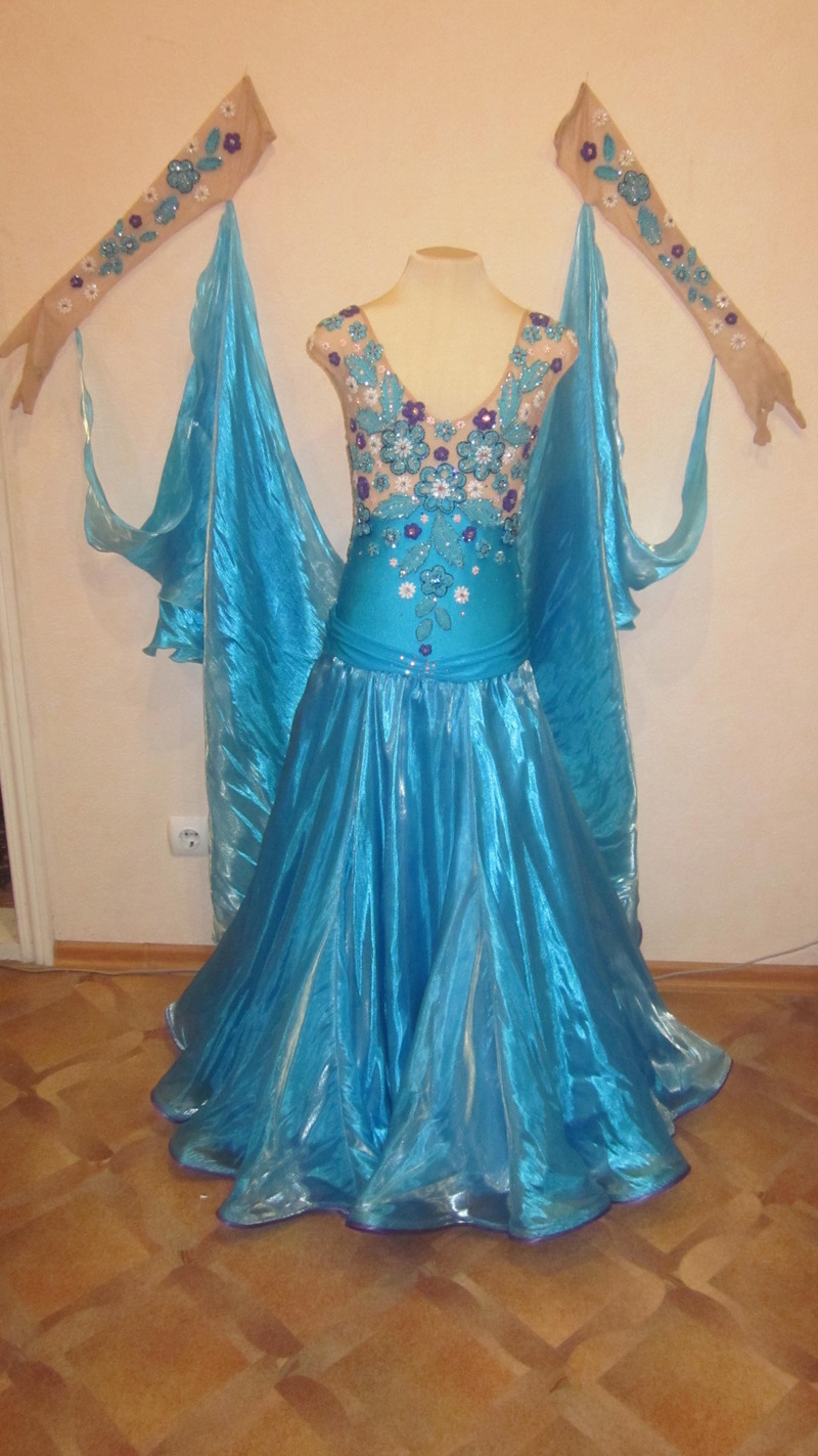 платье бальное стандарт синяя органза, на лифе сетка цвети обшити бисером, камни в каждом цветке сваровськи, перчатки, длина юбки 100 см |