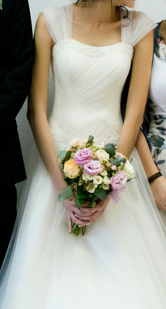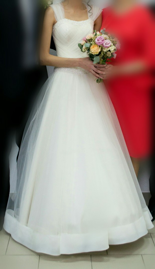 Свадебное платье 42-48 размер. Длина - 1.76 см. Цвет - айвори. Сверху есть шлейки из сетка-фатина, по надобности, они снимаются. Корсет выполнен нежной, фатиновой драпировкой. Юбка - фатиновая, подол платья - оформлен атласной лентой. Состояние - бу, но после стирки будет - новое!!! Обращайтесь! |