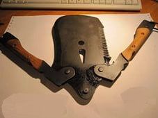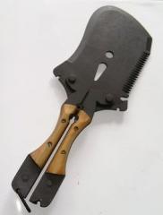 Производим и продаем. Лопатка саперная многофункциональная: лопата, топор, пила, гвоздодер, разводной ключ, кусачки. Складная, из рессорной стали 65Г. На ручках накладки из деревянных пластин. Рукоять в сложенном состоянии закрывает лезвие лопаты, в разложенном фиксируется стопором. Лопата комплектуется чехлом из ткани, который удобно носить на поясе. Длина в разложенном виде 39 см, вес 1200 гр. |