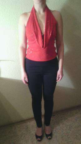 Шикарная,эпатажная, ярко-красная майка с умеренным количеством блёсток, открытой спиной и умопомрачительным декольте.Девушки, в такой майке вы точно не останетесь незамеченными противоположным полом;)Майка, купленная в Праге.Здесь такой не встретите. Из стрейчевой ткани, сшитой "вдвойную". По спинке ряд шлеек.Размер 44. |