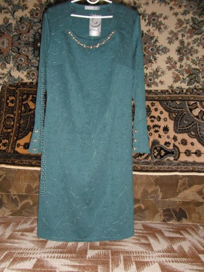 Красивое нарядное женское платье новое (есть бирка). В реальности платье намного красивее, чем на фото. Ткань: плотный трикотаж 3d (с очень красивым узором). Цвет: темно-зеленый. Фасон: приталенный; к низу небольшая трапеция. Платье без брака и без каких-либо дефектов. Размер: 44 (на этикетке указан европейский размер 44, а наш это будет 50). Ширина плеч 39см, длина рукава 61,5см, полу обхват подмышками 49,5см, полу обхват талии 44см, полу обхват бедер 51см, полу обхват в самом низу платья 62см, длина платья 103см. |