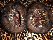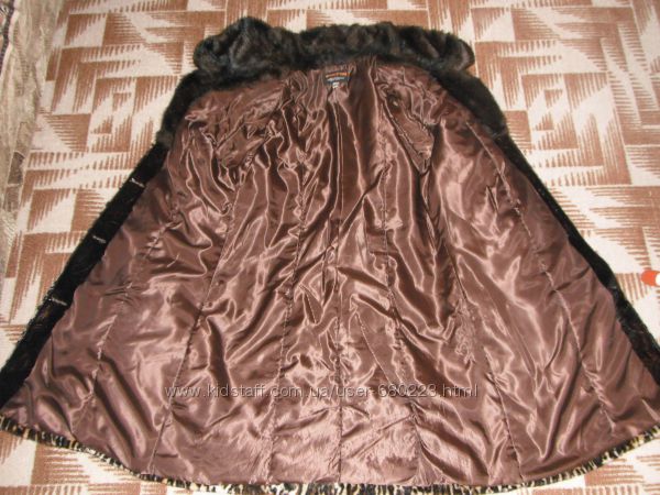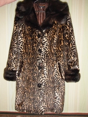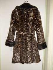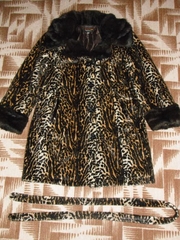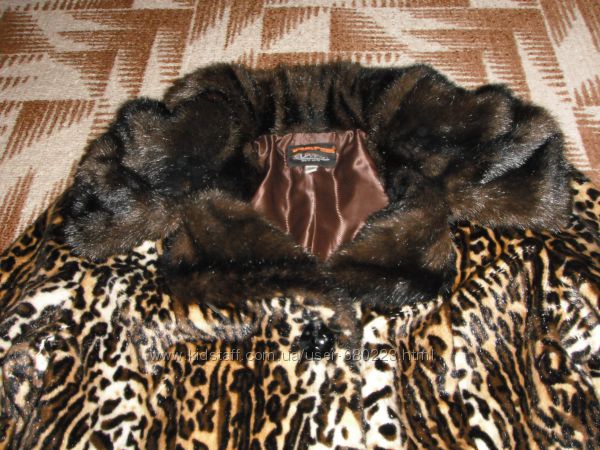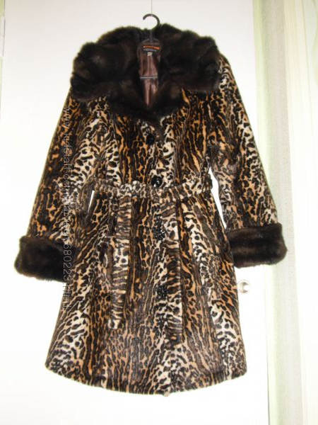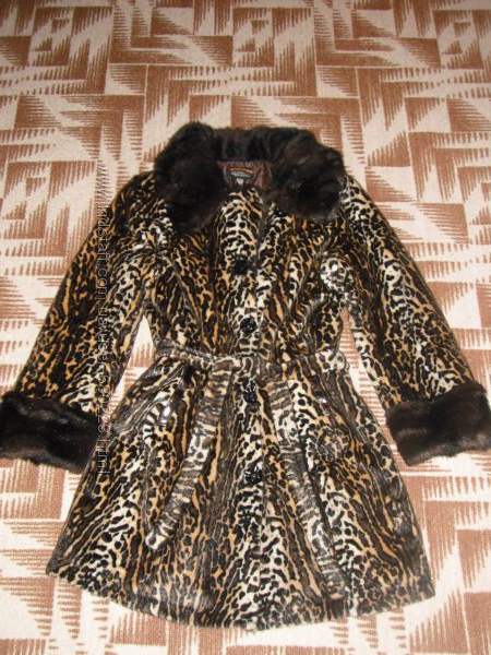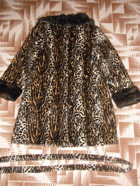 Женская шуба из искусственного меха б/у в хорошем состоянии. Шуба легкая и при этом очень теплая. Есть утеплитель. Мех мягкий, гладкий, блестящий. Расцветка леопардовая; воротник и манжеты - темно-коричневая искусственная норка. В реальности шуба очень красивая и нарядная, замечательно смотрится на женской фигуре. Из дефектов (все видно на фото 7 и 8): есть немного затяжек на подкладке и на торце манжет немного примят мех; все это в процессе носки не заметно. Размер: 52. Фасон: легкая трапеция от талии к низу. Ширина плеч 44см, полу обхват подмышками 55см, полу обхват талии 51см, полу обхват на уровне бедер 59см, полу обхват низа 65см, длина рукава 64см, длина шубы 93см, длина пояса 171см. Шуба застегивается на 5 пуговиц. Карманы: 2шт. Возможен торг.