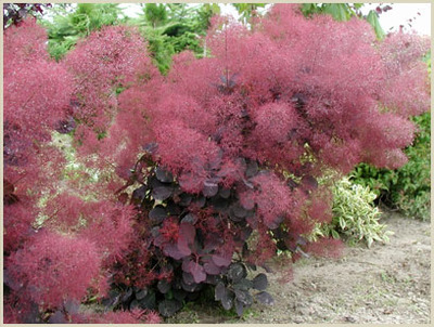 Royal Purple - очень яркий сорт скумпии с красивыми темными округлыми листьями и красноватыми пушистыми метелками. От зеленой скумпии отличается меньшей зимостойкостью, но весной быстро восстанавливает замерзшие побеги. Скумпия - декоративное дерево или кустарник с необычными пушистыми метелками плодов, благодаря которым она получила названия "париковое" и "дымное" дерево. Любит солнечные, прогреваемые места, защищенные от сильных ветров. Молодые побеги часто не успевают полностью одревеснеть и могут подмерзать зимой. Предпочитает легкие почвы без застоя воды. В год посадки скумпия нуждается в укрытии на зиму. |