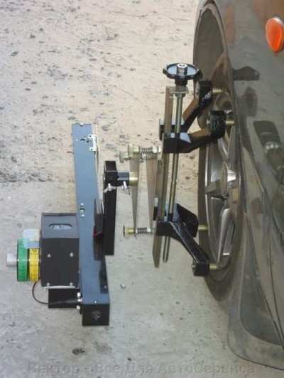 Отличительные особенности: крепление измерителей на автомобиле, питание от батареек, диски до 20 дюйм, привязка к задней оси, измерение кастера и KPI.